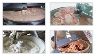 1. 斬拌機(jī)利用斬刀高速旋轉(zhuǎn)的斬切作用,將肉塊,碎肉,脂肪等主要原料精細(xì)的斬切成肉餡或肉泥,同時(shí)將其它原 料如水、冰片、輔料一起攪拌成均勻的乳狀物。斬刀高速旋轉(zhuǎn),可以縮短運(yùn)行時(shí)間,減少物料發(fā)熱量,保持餡料的 天然色澤、彈性、出品率和產(chǎn)品的保質(zhì)期。此外,該設(shè)備還適合用于魚(yú)類(lèi)、水果、蔬菜的粉碎加工。